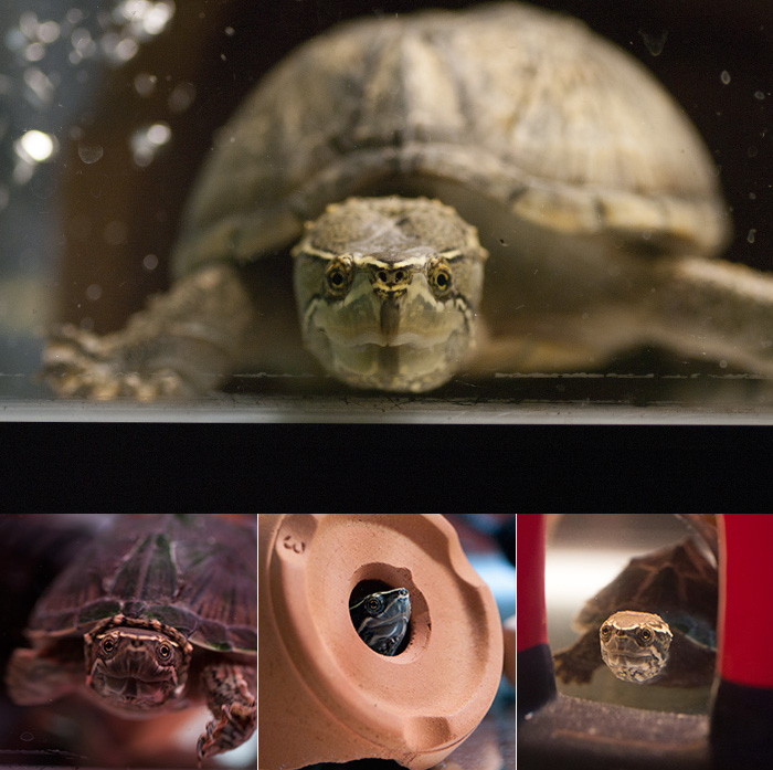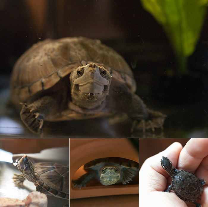 ウチにやって来た最初のミシシッピニオイガメ。我が家の癒し係担当です。特徴は垂れ目のファニーフェイスと頭頂部の大きなホクロ。
