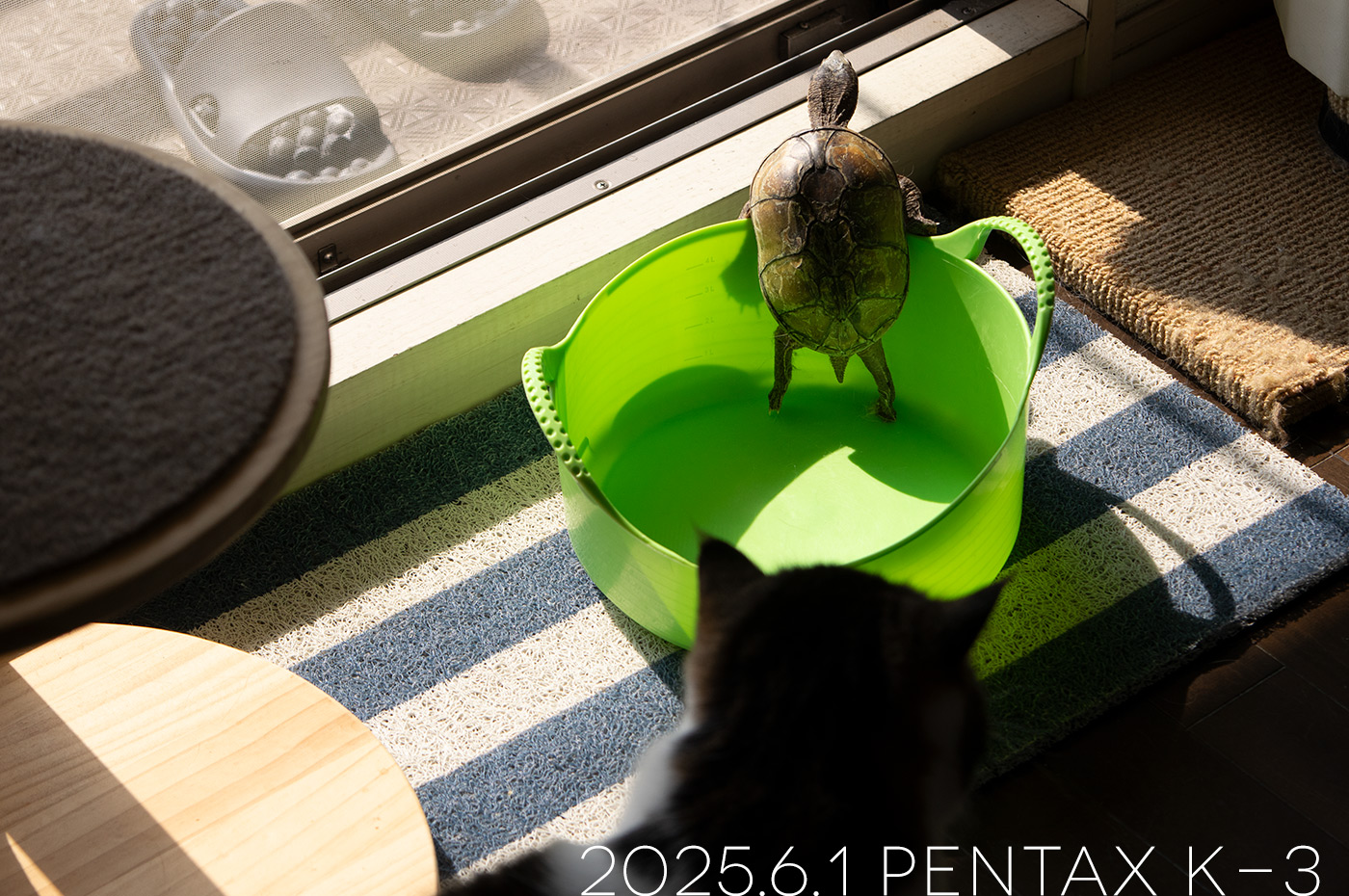 ここはどこでしょう? つぶらが顔を出している場所、それは3コインズで買った「ウォータープレイ」というオモチャのプールです。このブログに登場したのは去年の5月でしたね。 水換え中の待機所なので、今日はとりあえず水無しのアス […]