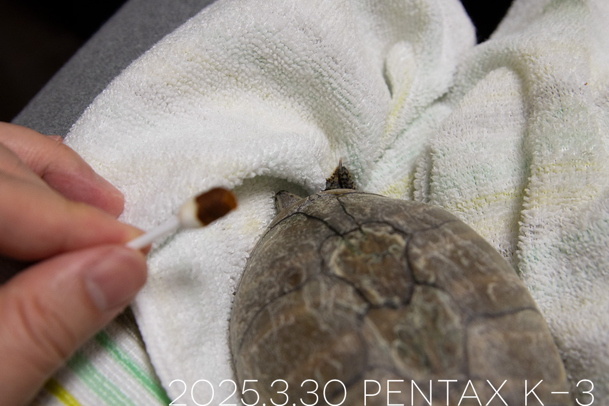 押し問答の末にイソジンを塗布しても、しばらくすると乾燥してかさぶたが剥がれます。改めて傷口にイソジンを塗り、乾かしてから水槽へ戻しました。